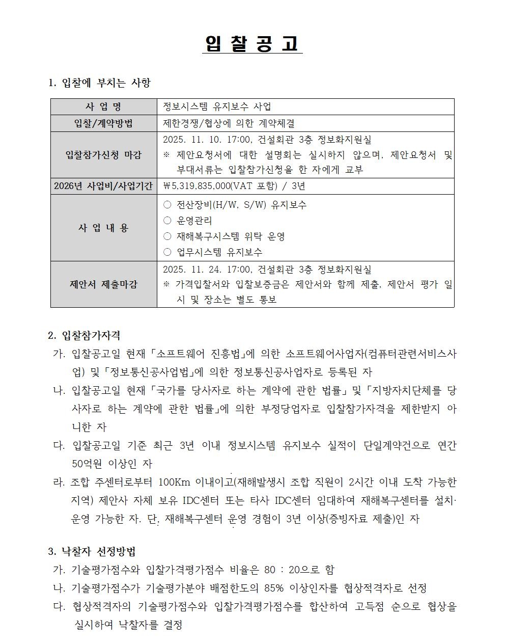 정보시스템 유지보수 사업 입찰공고